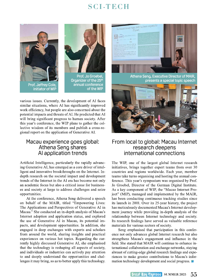 由亞太傳播交流協會(APCEA)出版及發行的英文刊物《大灣區快訊》(Great Bay Express)於2025年11月出版了第8期,其中發佈了《智能互聯新時代:生成式AI重塑社會發展路徑》的報道。
