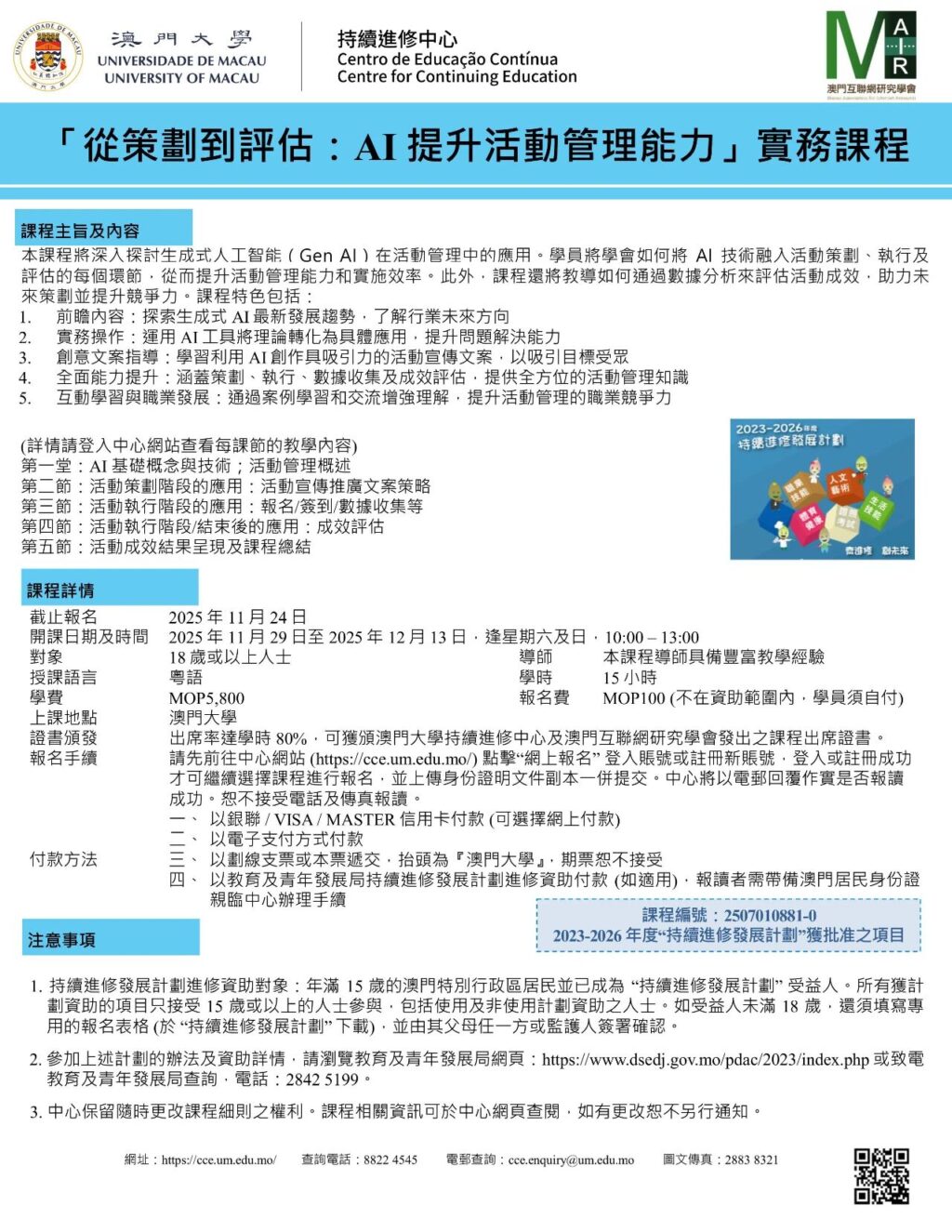 報名方式:澳門大學持續進修中心網頁 (https://cce.um.edu.mo)