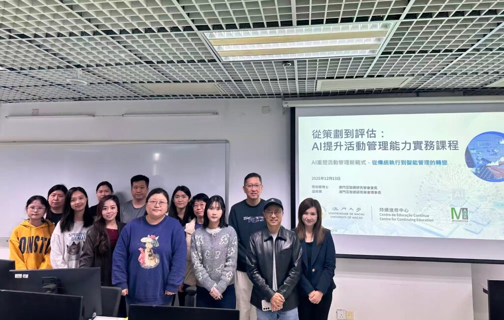 為配合澳門特別行政區政府“1+4”經濟適度多元發展策略,推動會展及社區活動的智能化轉型,澳門大學持續進修中心與澳門互聯網研究學會聯合舉辦“從策劃到評估:AI 提升活動管理能力實務課程”,為澳門業界培育具備前沿 AI 應用能力的實戰人才。