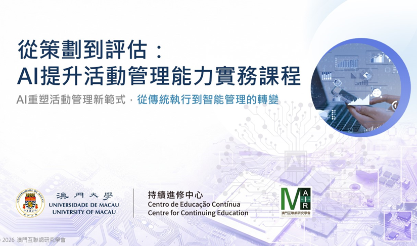 為配合澳門特別行政區政府“1+4”經濟適度多元發展策略,推動會展及社區活動的智能化轉型,澳門大學持續進修中心與澳門互聯網研究學會聯合舉辦“從策劃到評估:AI 提升活動管理能力實務課程”,為澳門業界培育具備前沿 AI 應用能力的實戰人才。